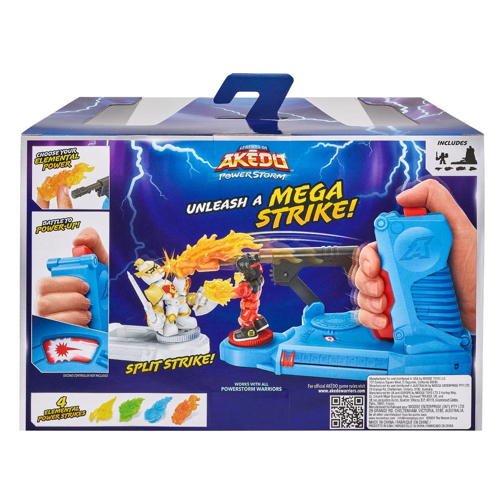 Power Up your battle and unleash the power of the Powerstorm with the Legends of Akedo Powerstorm Mega Strike Controller with Elemental Punch Action! Choose your Elemental power. There are 4 Element Attack pieces in this Pack. Attach your Element to the Controller. As you press the trigger and battle, you will build up your power! The Power Gauge on the Controller will start to rotate as your power is increasing. Once full Power Mode is reached, push the button on top to unleash a massive Mega Strike! The Akedo Powerstorm Mega Strike Controller includes an Exclusive Fire Strike Chux Turbo Action Warrior. There are 42 new Warrior Battling Warriors to collect. Ready! Fight! Split Strike!
