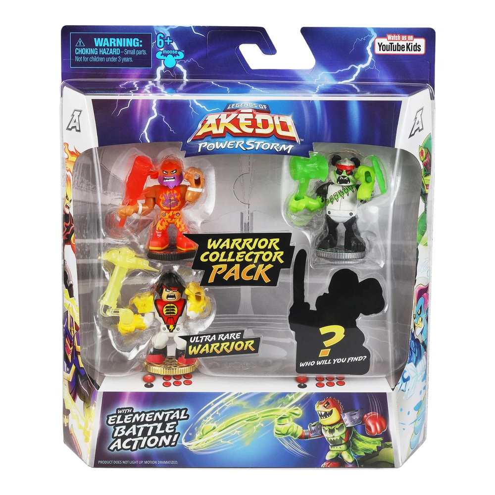 Get ready for some Elemental Battle Action! Introducing the Legends of Akedo Powerstorm! Boosted with Elemental Powers, the Akedo Warriors are back to battle with new Weapons, Fighting Styles and Game Play! There are 42 new Battling Warriors to collect. Plus each Mini Battling Warrior is power-boosted by one of the six Elements: Earth, Fire, Water, Light, Shadow and Lightning! There are Classic, Epic, Ultra Rare, Legendary and “Power Strikers” Warriors to discover! Collect deep into Akedo with the Akedo Powerstorm Warrior Collector Pack. This awesome Pack contains 4 Akedo Warriors including a guaranteed Ultra Rare Warrior! Each Collector Pack also contains a Mystery Warrior for you to unbox! Will you find a Limited Edition Lord Shifta inside? The Warrior Collector Pack also includes the Official Akedo Rulebook. There are 3 different Collector Packs available. Ready! Fight! Split Strike!